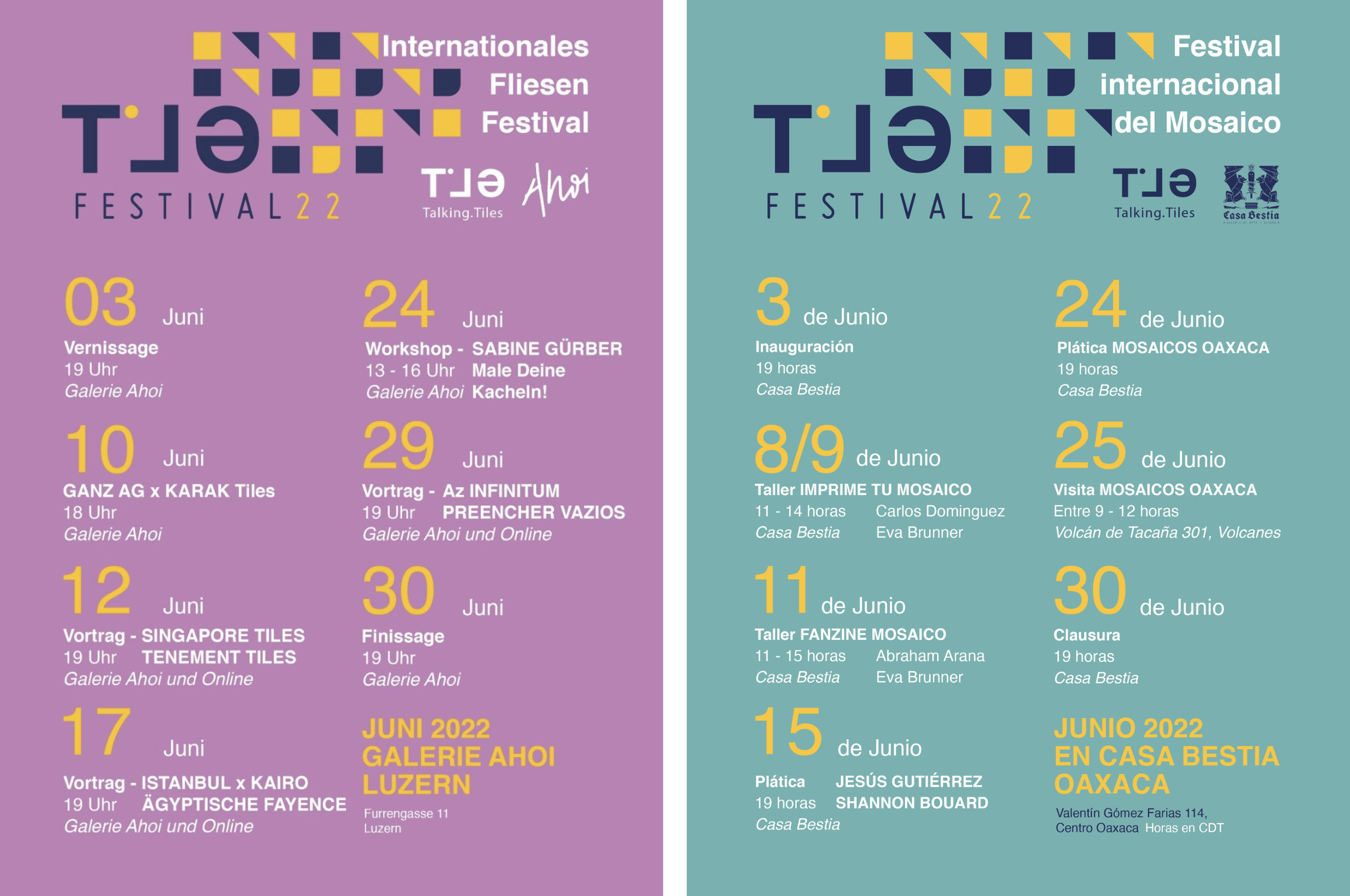 Das Tile Festival 22 findet zeitgleich im Ahoi Luzern, der Galerie Casa Bestia im mexikanischen Oaxaca, sowie virtuell statt. Es verbindet Architekt:innen, Produzent:innen, Künstler:innen, Designer:innen und Interessierte zum Thema «Kachel» – mit Präsentationen, Workshops und mehr.